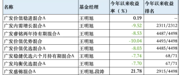 ifind数据显示,王明旭管理的广发内需增长混合、广发睿铭两年持有期混合、广发价值优势混合、广发价值优选混合、广发稳健优选六个月持有期混合和广发均衡优选混合今年以来的收益均为负,同类排名倒数。