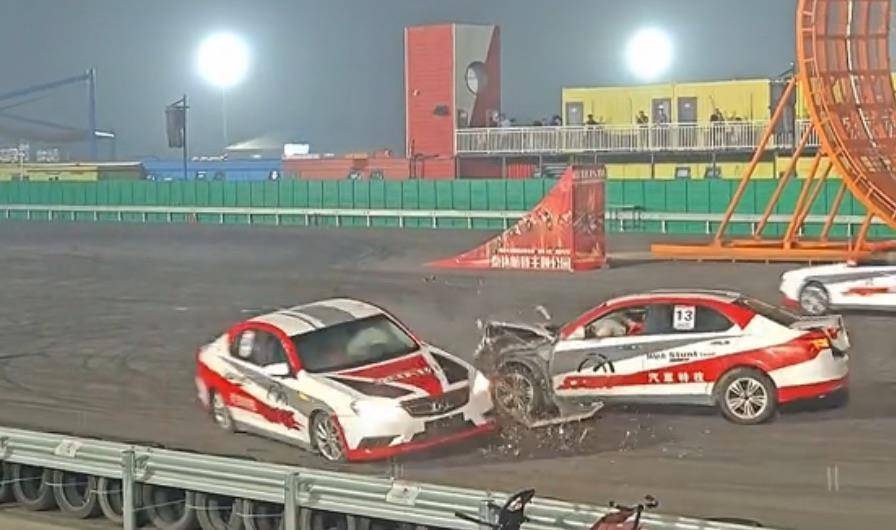 天津泰达航母主题公园一名工作人员表示,撞车导致车辆有些受损,车手身体无碍。目前极限追逐的表演仍按照原计划进行,暂未接到其他安排。